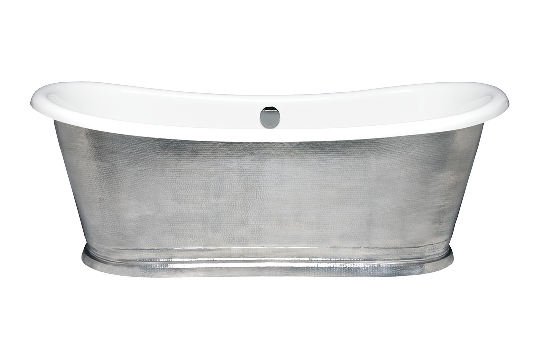The contoured shape of the Americh Sawyer freestanding tub is offered in a choice of four exterior shells to suit your style: smooth nickel, hammered nickel, smooth unlacquered brass and white acrylic. Available through Bender.