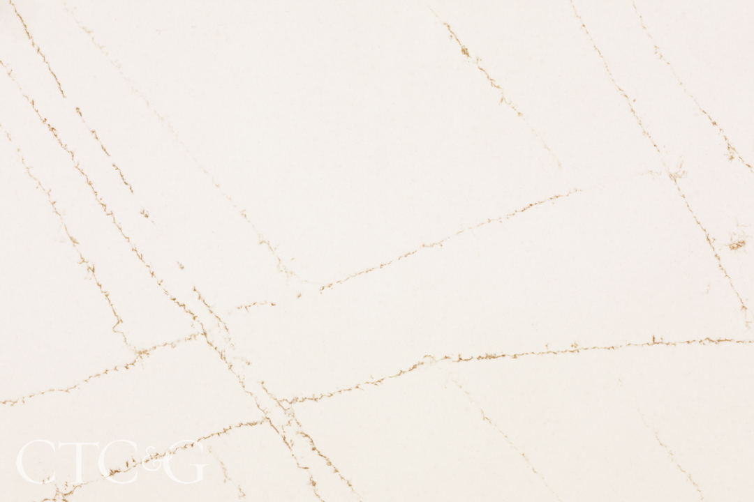 The polished finish of Aterra Verity, a new quartz surface by Caesarstone, is punctuated with sweeping lines of bronze and copper on a cloudy white background. Available through Ring’s End.
