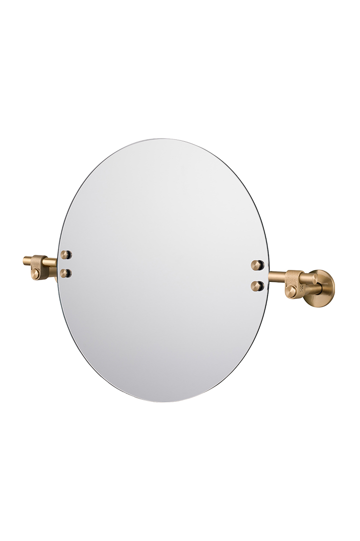 This circular mirror from Buster + Punch can be tilted on its axis for height adjustment. The mirror is accented with brass PVD-finished solid metal details, including the brand’s signature rough-cast knuckle. Available through Laurent Lighting.