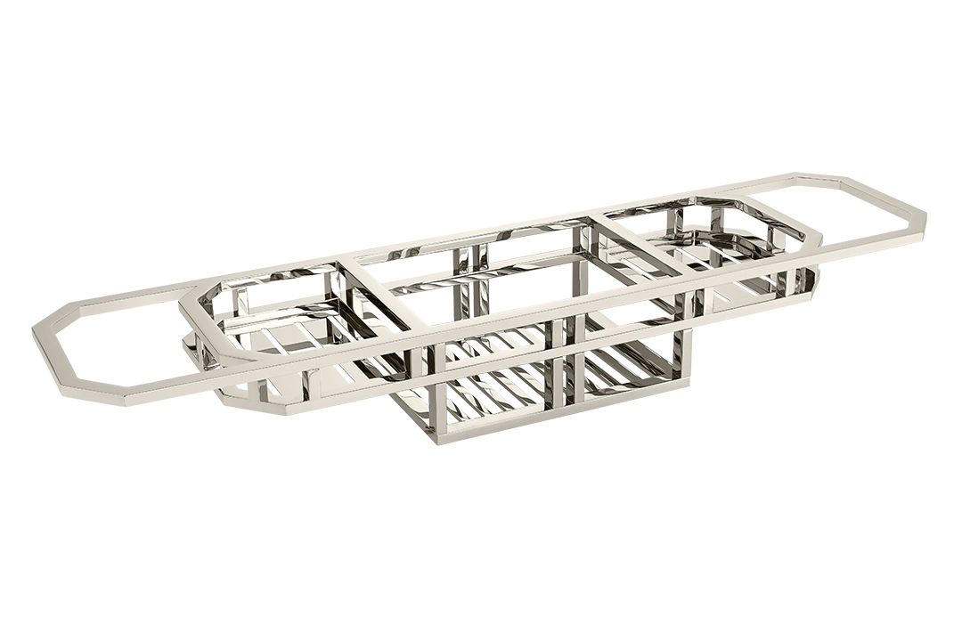 British brand Drummonds collaborated with interior designer Steven Gambrel to develop a series of jewelry-like bathroom accessories. The eight-piece Colvin collection includes this luxurious bath rack, handcrafted in solid brass at the Drummonds Brassware Foundry.