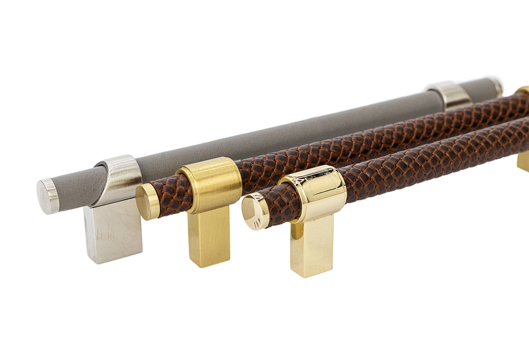 Keeler Brass Company’s Anthology series of architectural hardware gives clients the option to select each component— the bar, posts, finish and material—for a truly custom piece. Two new leather options have been added to the collection, a gray leather and a brown leather wrapped on the bias for a basketweave look.