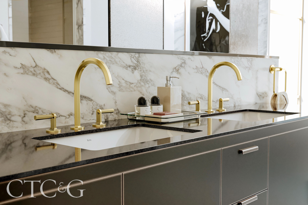 Straight from the runways of Paris and Milan, Rohl’s Modelle collection takes its cue from haute couture. Furniture and interior designer Xander Noori created the collection with an emphasis on graceful lines in glamorous finishes. Shown here, the Modelle widespread faucet with C-Spout in Antique Gold. Available through White’s Plumbing.