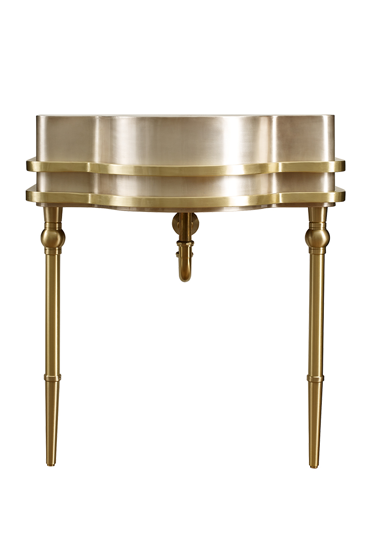 Handcrafted metal and soft curves define Thompson Trader’s Quintana Collection by Kara Cox. The vanity is finished in an elegant mix of satin brass and burnished nickel. Available through Ferguson.