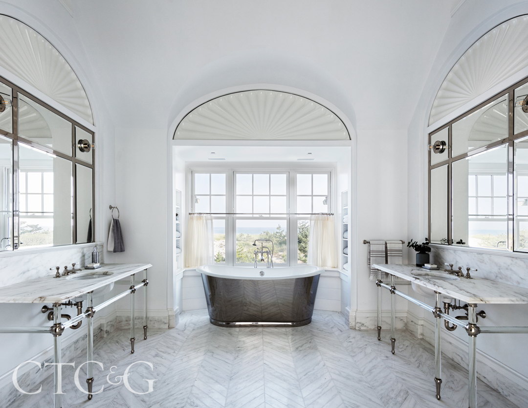 This waterfront home warranted a bathroom equal to its stunning view. Designed by Burr Salvatore Architects and built by Hobbs, Inc., the bathroom presents quiet luxury with bespoke appointments in a sophisticated palette. Matching Urban Archeology washstands in polished nickel and glass are paired with honed Imperial Danby stone tops and Waterworks faucets. The herringbone floor pattern is reflected in the metallic sheen of the tub.