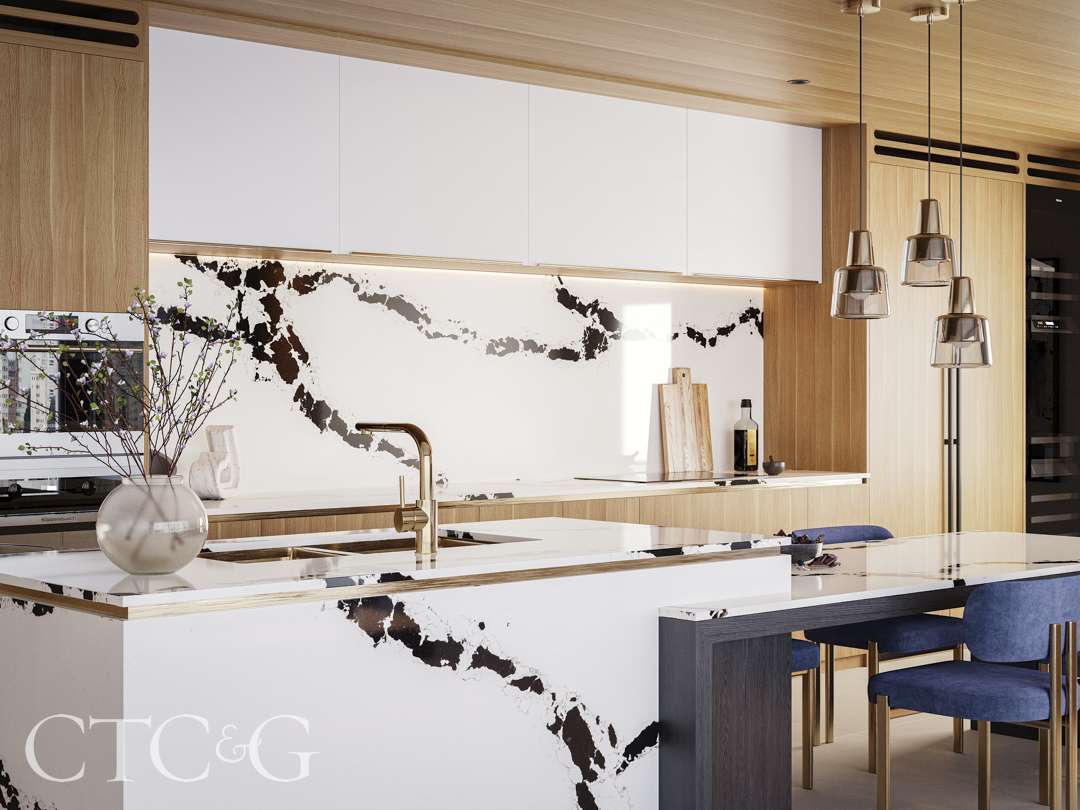 Bring on the drama with Calacatta Scoria quartz from Caesarstone. Rich black veining and granular streams of dark minerals pop against a white background. Price upon request, available through Connecticut Stone.