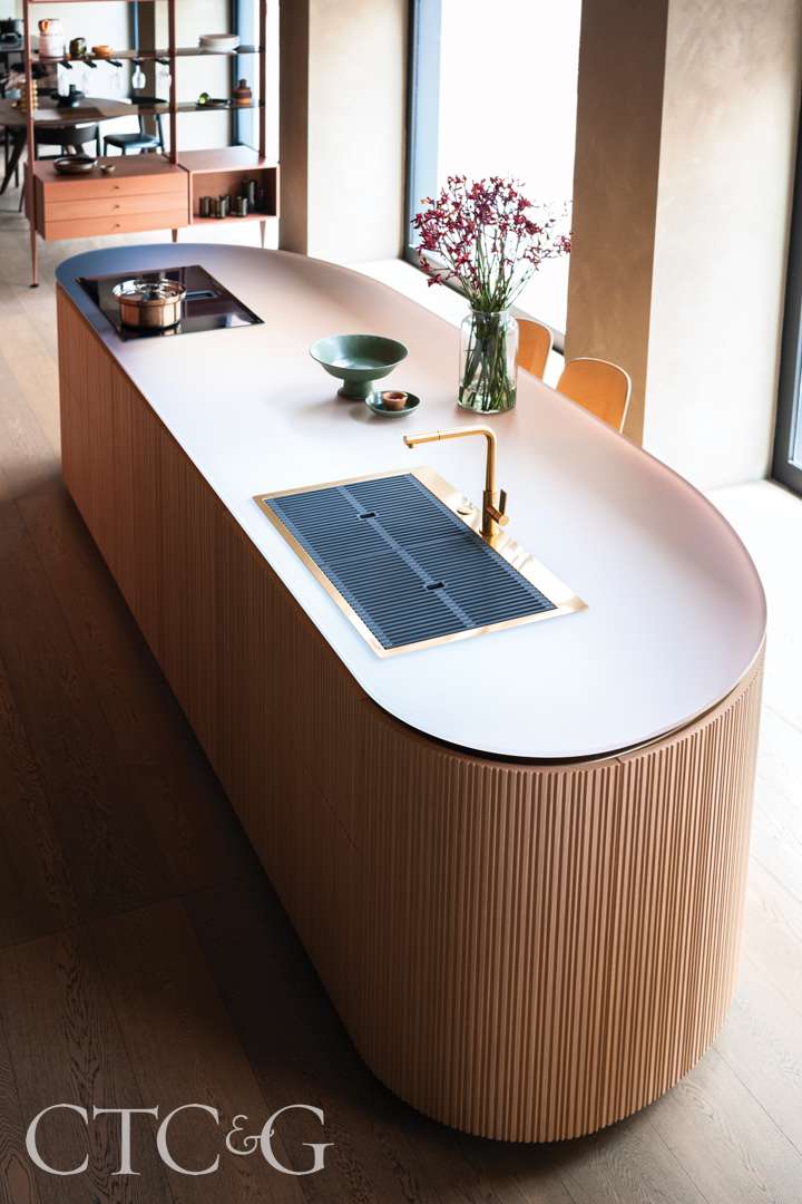 With sculpted curves and grooved doors,the modules of the Tangram collection by Garcia Cumini for Cesar allow for unusual compositions and unique shapes like this kitchen island with a polished glass Nuance top. Price upon request, available through Modiani Kitchens.