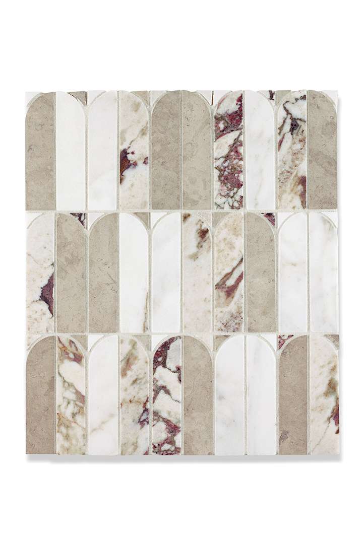 Bold and sophisticated, Calacatta Viola marble from Ann Sacks provides bursts of color with dramatic burgundy and violet veining on a field of cream and gold. The Arches and Crown mosaics are suitable for wall or floor applications. Available through Kohler Signature Stores for $60 per square foot.