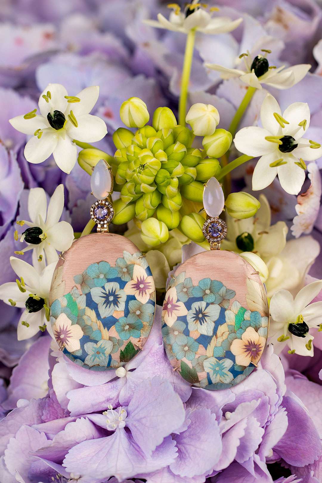 These earrings with a miniature painting of a Nantucket scene are topped off with sky blue topaz, pink tourmaline, and diamond detailing.