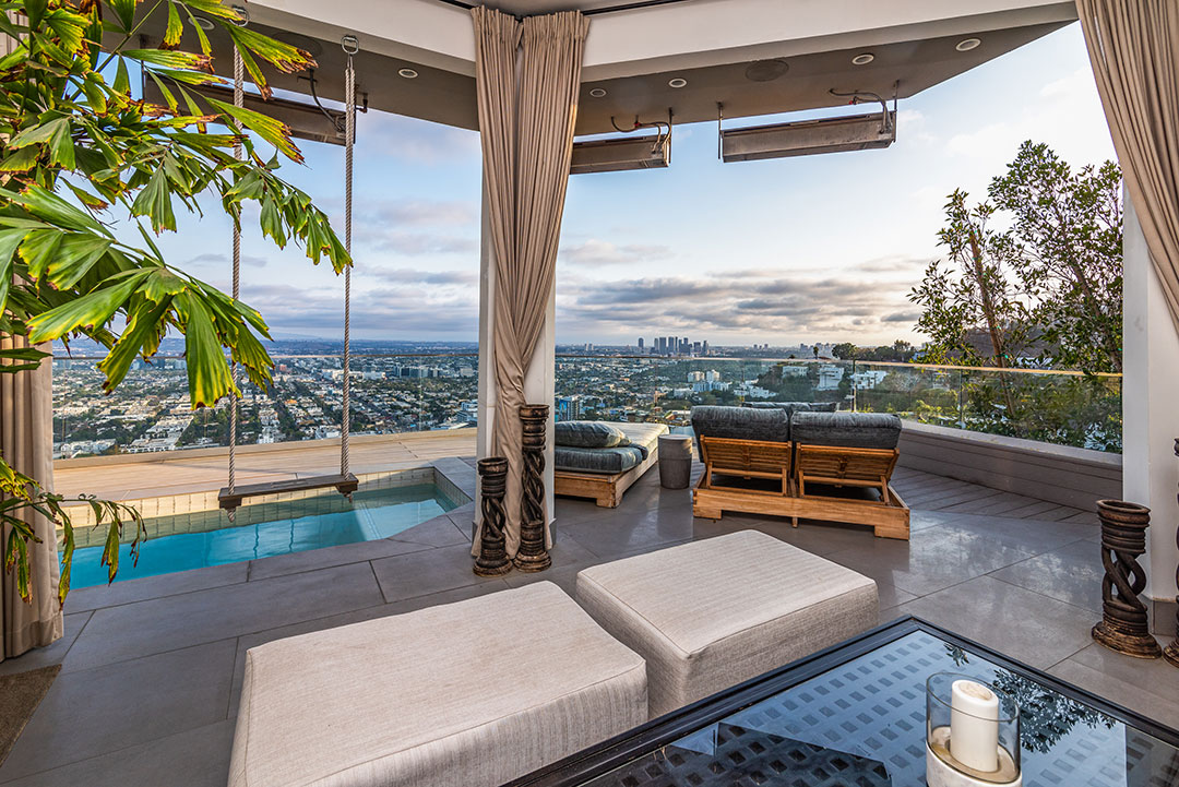 Though the home boasts an ultra-comfy movie theater that features posters from movies and plays the homeowner has participated in (Men in Black 3, Dirty Dancing, Moana), the ultimate entertaining destination is outside. A covered indoor/outdoor lounge overlooks the city and swimming pool/jacuzzi. The singer says she “went to the ends of the Earth” to create the six-foot deep pool on her hillside property.