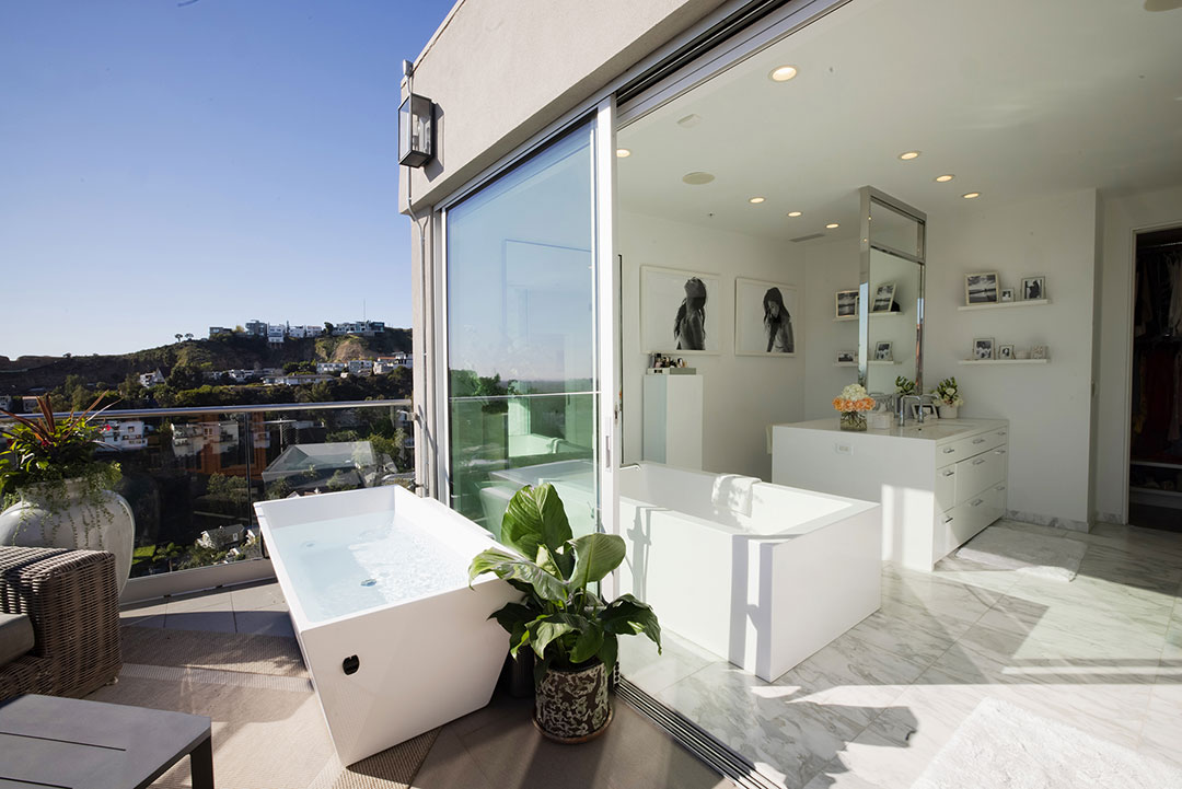 Currently, the four-story home is filled with a muted palette complemented by the singer’s art collection. While there are a total of four bedrooms and five bathrooms, Scherzinger’s primary suite is the star. It includes a marble fireplace, steam shower, soaking tub, vanity, and a private balcony. “I feel literally like I’m on top of the world,” Scherzinger said in 2019 from her bedroom’s balcony, which is complete with a firepit.