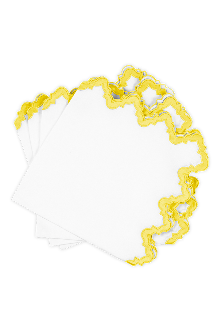 Inspired by Moroccan tiles, Matouk’s Aziza napkin is appliqued with a bright yellow sateen border. Sold as a set of four, $432, available through the Linen Shop.
