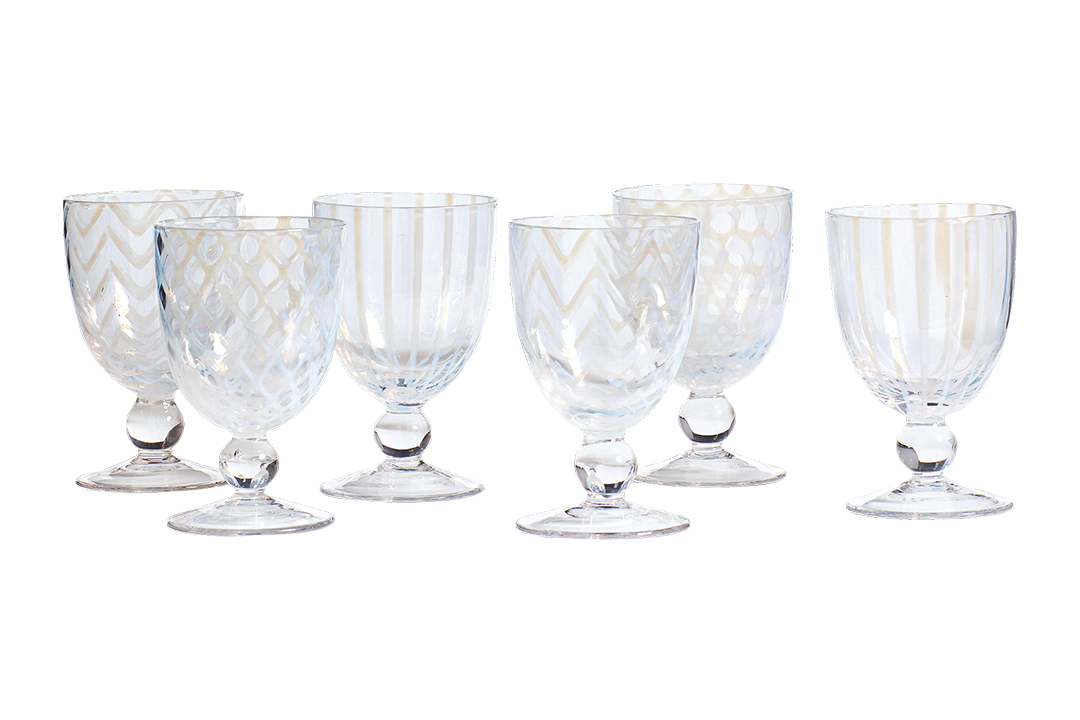 Sold as a set of six in various patterns, Oka’s Pulcinella wine glasses are decorated by hand with spots, stripes and diamond designs. $125, available to order at the Westport store.