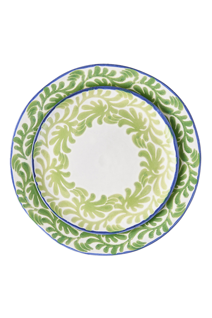 Discovered on a trip to Portugal, this Hudson Grace Rustic Stoneware is hand-painted in a verdant vine pattern that can be easily mixed and matched. Appetizer plate, $14; salad plate, $18.