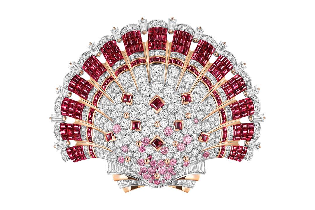 Coquillage Mystérieux Clip is a clam shell with rubies, emerald, pearl, and pink and white diamonds, set in 18k rose-gold, yellow-gold and white-gold. On the back, a fairy standing on a pearl is perched on a gold coral reef.