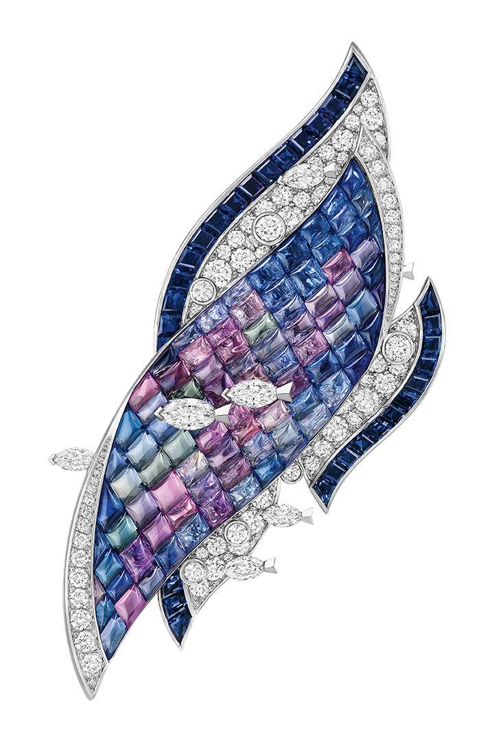 Poissons Mystérieux Clip features fish on vitrail Mystery Set waves, with blue and mauve sapphires and diamonds in 18k white-gold.