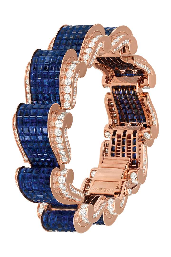 Écume Mystérieuse Necklace in18k white-gold and rose-gold, uses the maison’s signature Mystery Set style, with sapphires, diamonds and white-gold, giving the illusion of waves and seafoam.