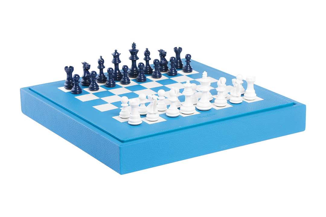 ALEXANDRA LLEWELLYN’s “The Chase” leather travel backgammon set features a swimming pool as its base.