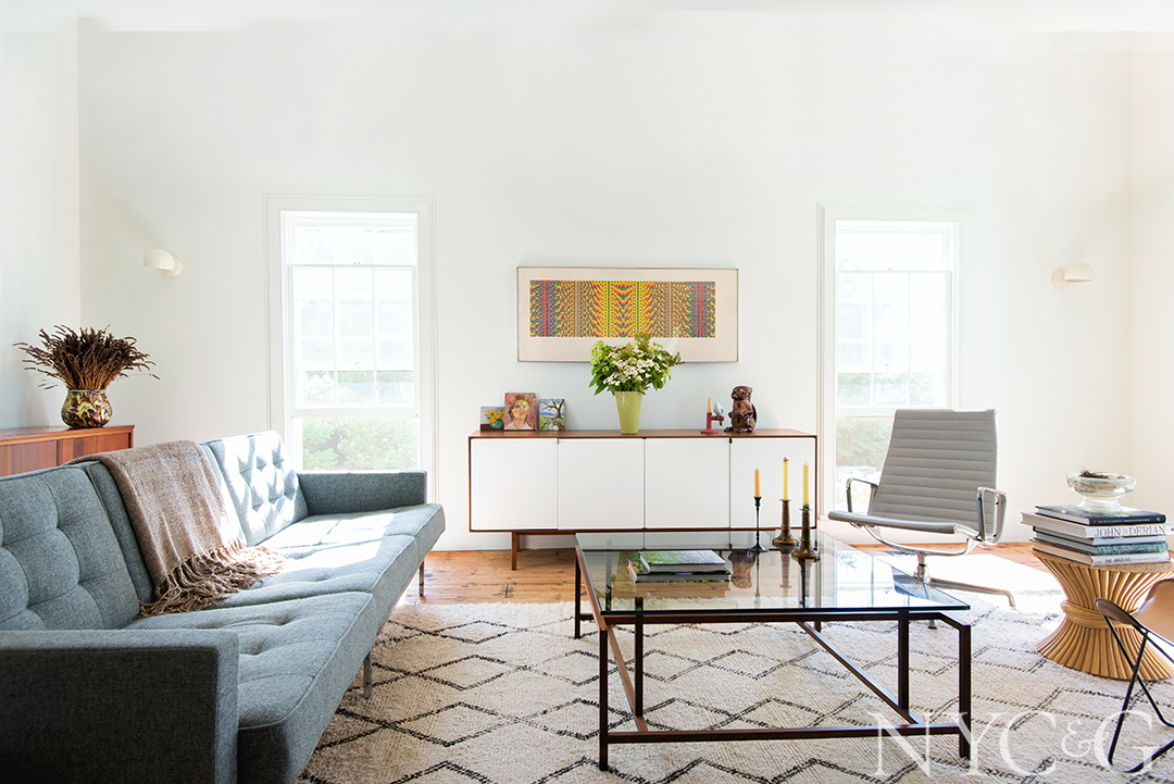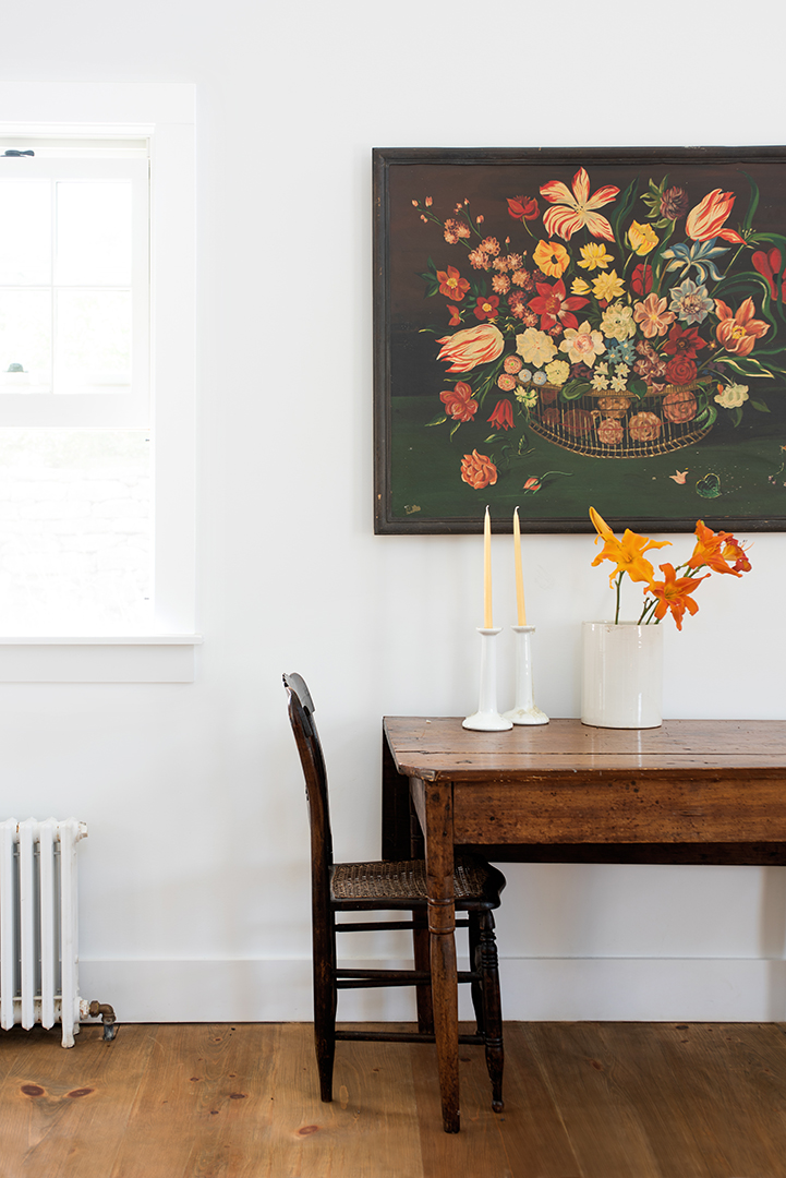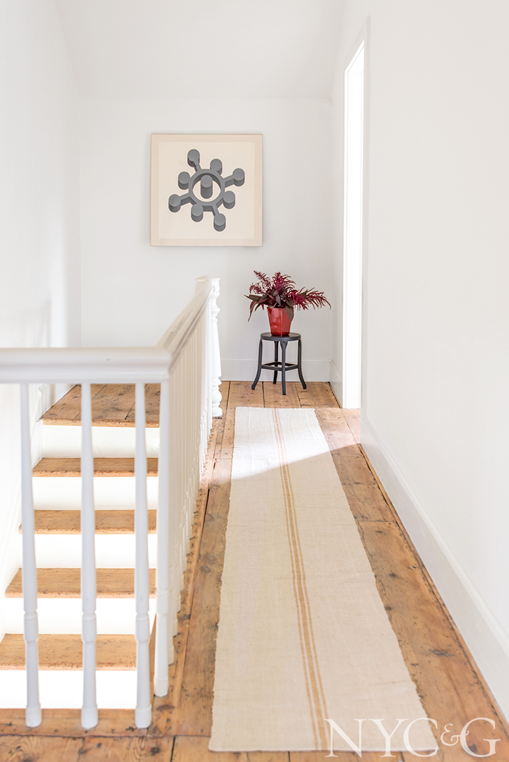 Not many weekenders are keen on total makeovers, but not surprisingly, the project came naturally to Malin and Goetz, proprietors of the skincare company that bears their names. Borrowing a term popular from their industry’s vernacular, they set out to apply a “luminescence” to the home’s claustrophobic interiors—windows sealed with Plexiglas, a stained-glass transom, dark lacquered floors, dreadful peach walls. After dismantling the Plexiglas, opening up the “cubbyhole” entry hallway, and installing floor-to-ceiling windows in the kitchen and library, they ushered in the light. Wood floors were sanded down to their natural color, ceiling heights raised, rooms eliminated and consolidated, and bathrooms erased so that everything “feels like a breeze,” Goetz says. Outside, Malin removed invasive Norway maples, as well as deer-ravaged hemlocks and yews that previously added to the ambient gloom.