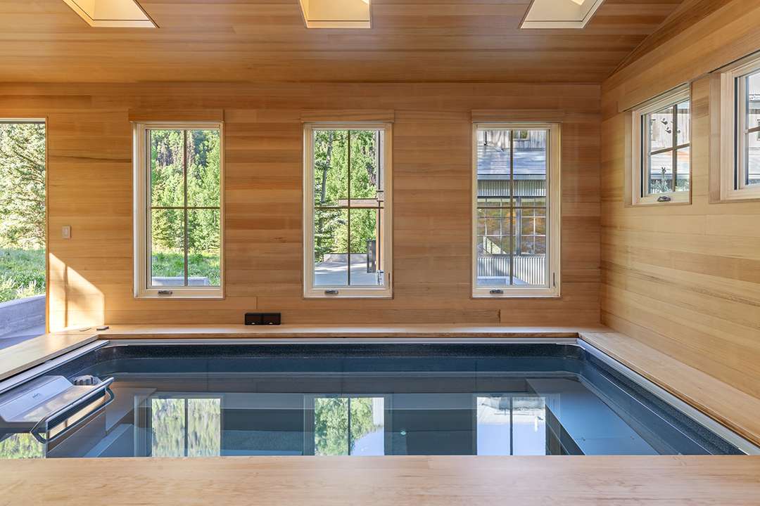 While wellness can unfold anywhere here, such as with journaling in the sunroom or watching the waterfalls flow with morning coffee as Cutler told the Wall Street Journal she often did, the estate’s second structure is clearly where to go for Zen moments. It’s called the bath house, and holds a lap pool, sauna, steam room, and yoga studio.