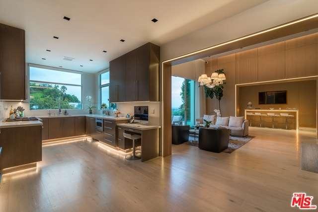 Additional amenities include an integrated Smart Home system, used for controlling the indoor and outdoor sound, lighting, and fireplaces. Private terraces with views of downtown LA, a home theater, game room, and fitness room.