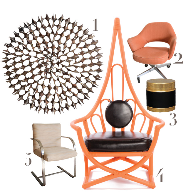 2 The architect Eero Saarinen was noted for his organic space-age forms, including this circa-1970 swivel armchair (31½” h. x 27″ w. x 21″ d.), which has been reupholstered in an out-there orange linen. $2,500, Robert Stilin, 74 Montauk Hwy., East Hampton, 631-329-7141.