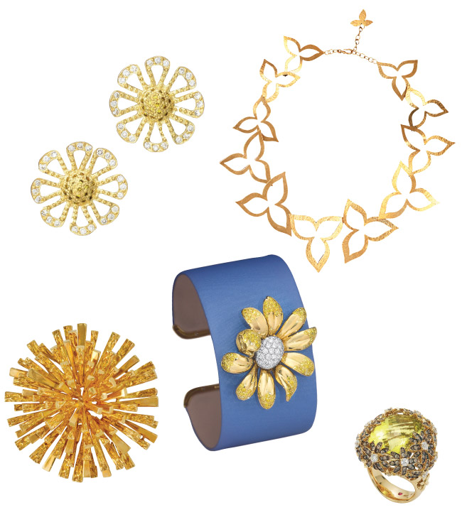 Clockwise from top: Paul Morelli Flower Power stud earrings in 18k yellow gold with white diamond and yellow diamond pavé, $3,550, by appointment at 12 W. 57th St., NYC, 212-247-4100; Hervé Van der Straeten tri-petal flower necklace in hammered 24k yellow gold–plated brass, $1,170, Bergdorf Goodman, 754 Fifth Ave., NYC, 212-753-7300; Roberto Coin Daisy cocktail ring in 18k yellow gold with green topaz and peridot, $6,980, Saks Fifth Avenue, 611 Fifth Ave., NYC, 212-753-4000. Circa-1969 Tiffany & Co. textured 18k yellow gold sunburst brooch, $11,750, Kentshire Galleries, 700 Madison Ave., NYC, 212-421-1100. Cornflower-blue satin bracelet with an 18k yellow gold daisy, white pavé diamond center, and yellow diamond pavé on the petals, $22,150, Cellini Jewelers, 509 Madison Ave., NYC, 212-888-0505.