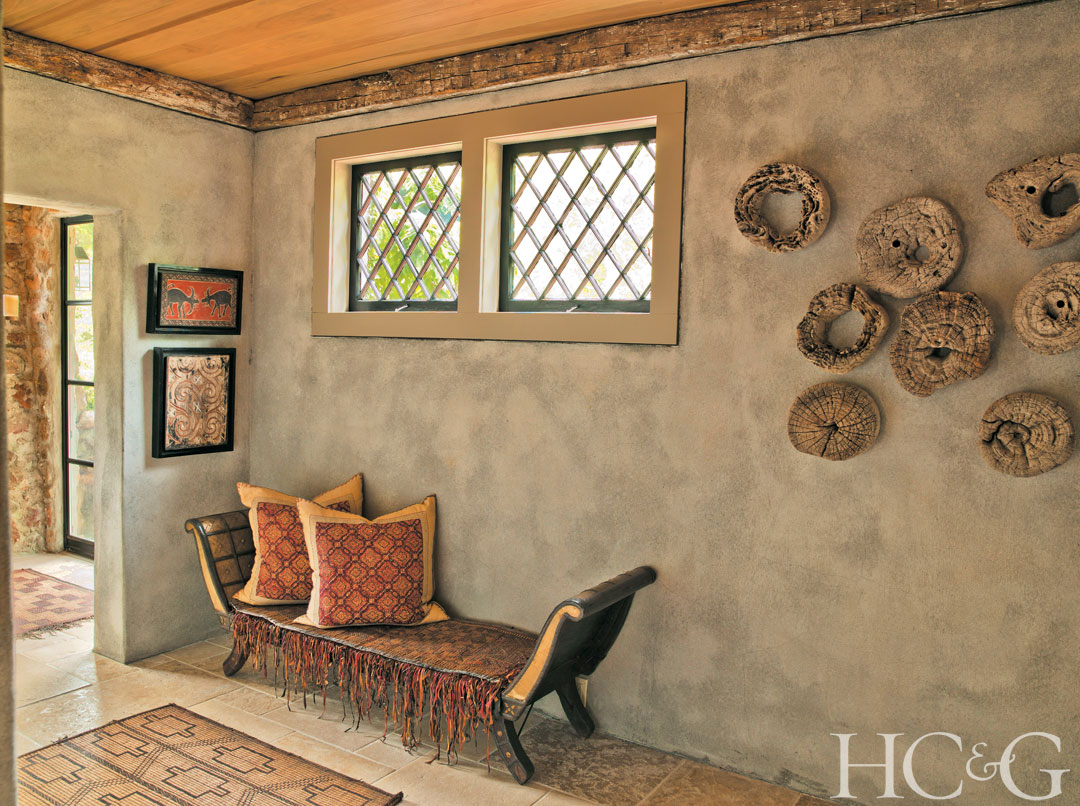 In the entry, a bench from ABC Carpet & Home and accent pillows from John Robshaw beckon. The eroded teak cuttings are from Andrianna Shamaris.