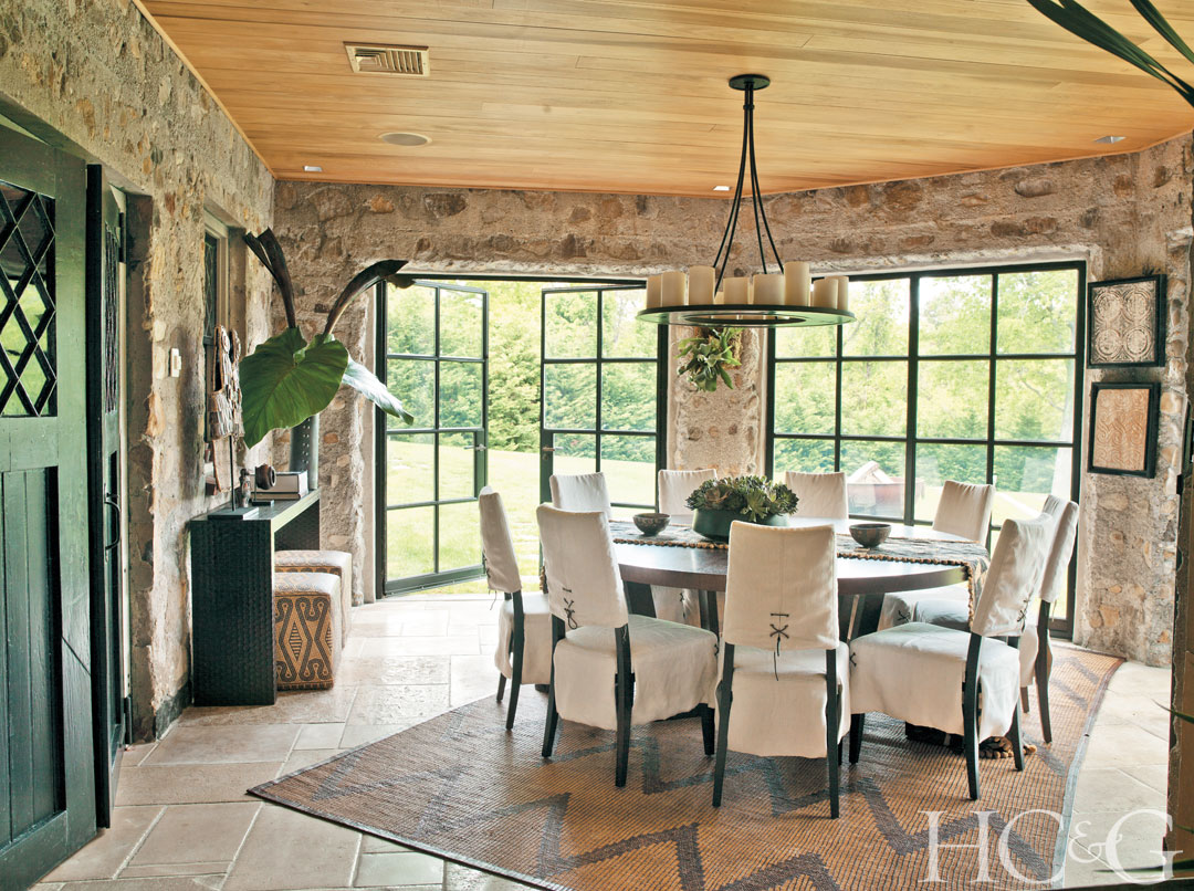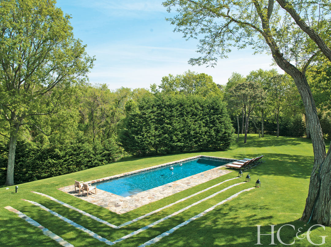 The two original wings of the L-shaped carriage house have been bridged with a newer, stone-walled dining room, which complements a series of parterred stone steps that lead to the swimming pool.