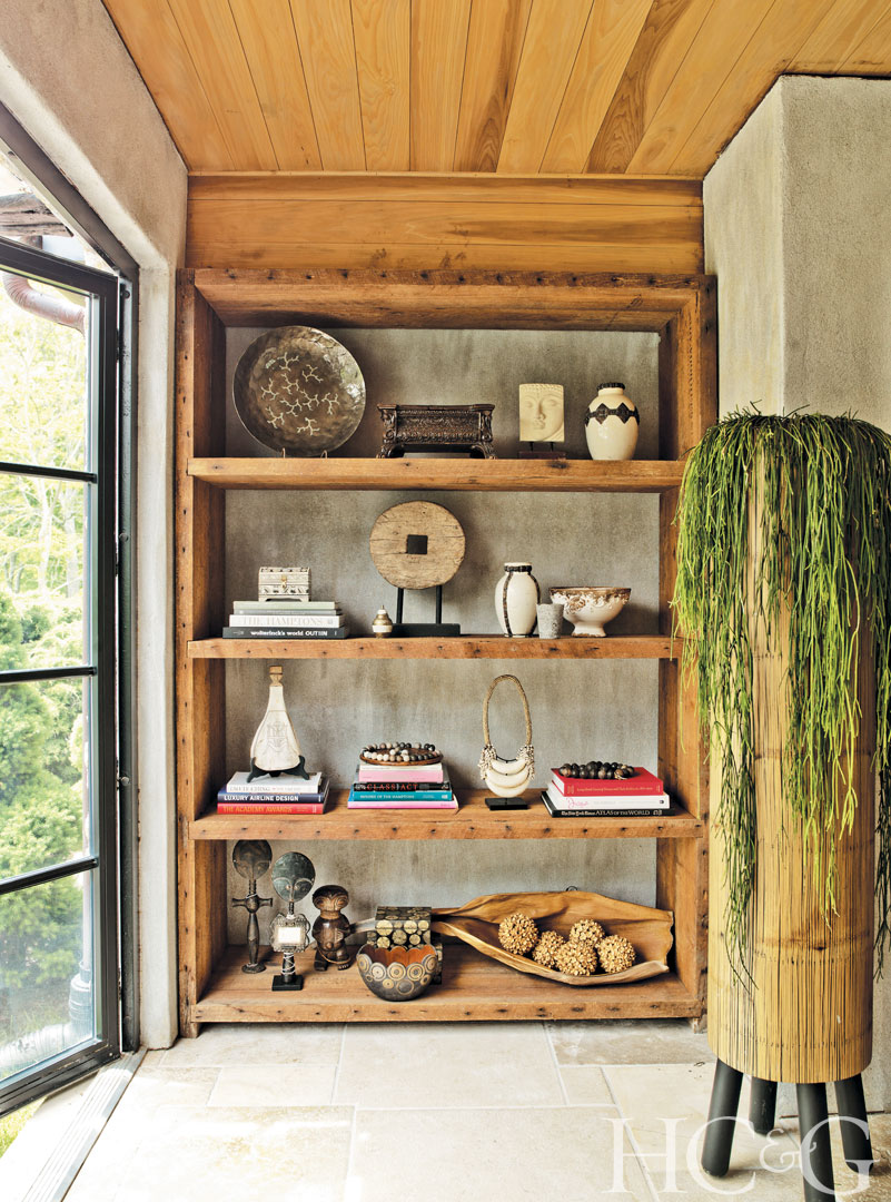 Homeowner and decorator Deborah Heimowitz displays artifacts from her travels on shelves in a corner of the living room. The Christian Tortu bamboo planter is from Pennington Flowers.