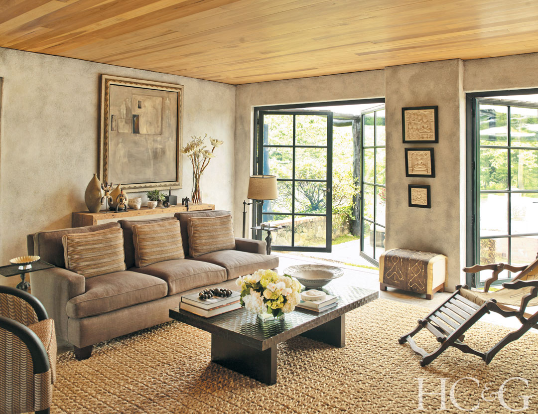 French doors lead from the living room to a patio. The sofa, by Barbara Barry for Baker, is covered in a Nobilis fabric.