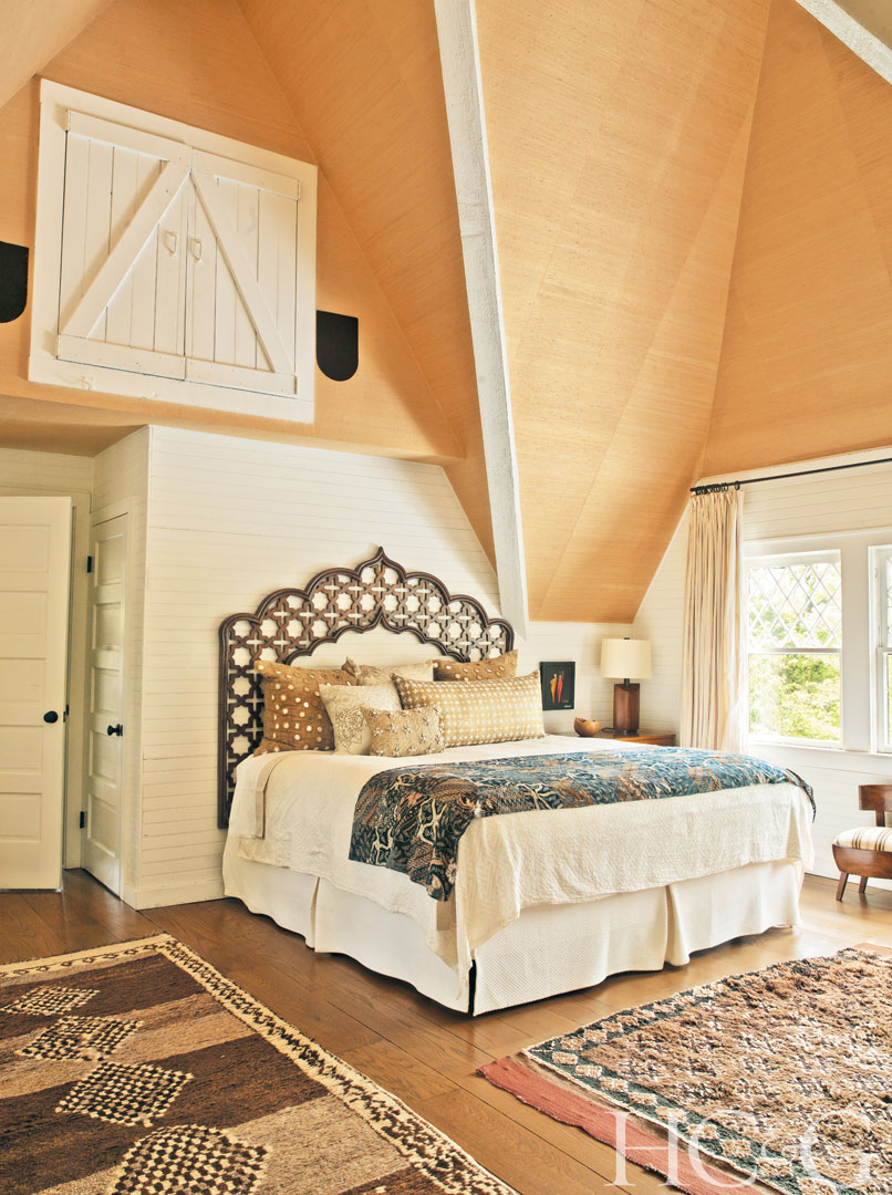 Grass-cloth walls in the master bedroom emphasize the house’s stunning architecture. The headboard is from John Robshaw; the batik throw is from Andrianna Shamaris.