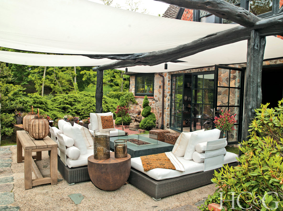 The patio includes sofas from Jardin de Ville and a fire pit coffee table from Restoration Hardware. The locust-post canopy is from Marders.