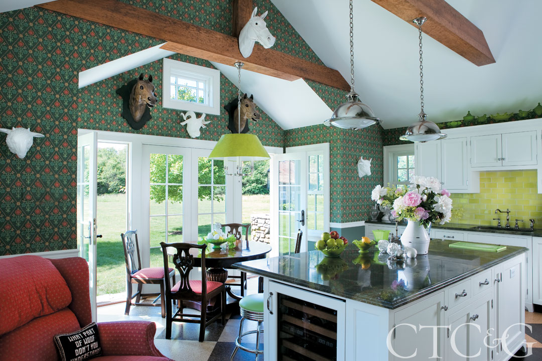 A white porcelain horse head, a pair of carousel pony heads, and a ceramic ram’s head add a touch of whimsy in the kitchen. Pratt & Larson lime backsplash tiles through Artistic Tile, plus Verde Oro marble countertops and island top from New England Stone reflect the colors of the landscape.
