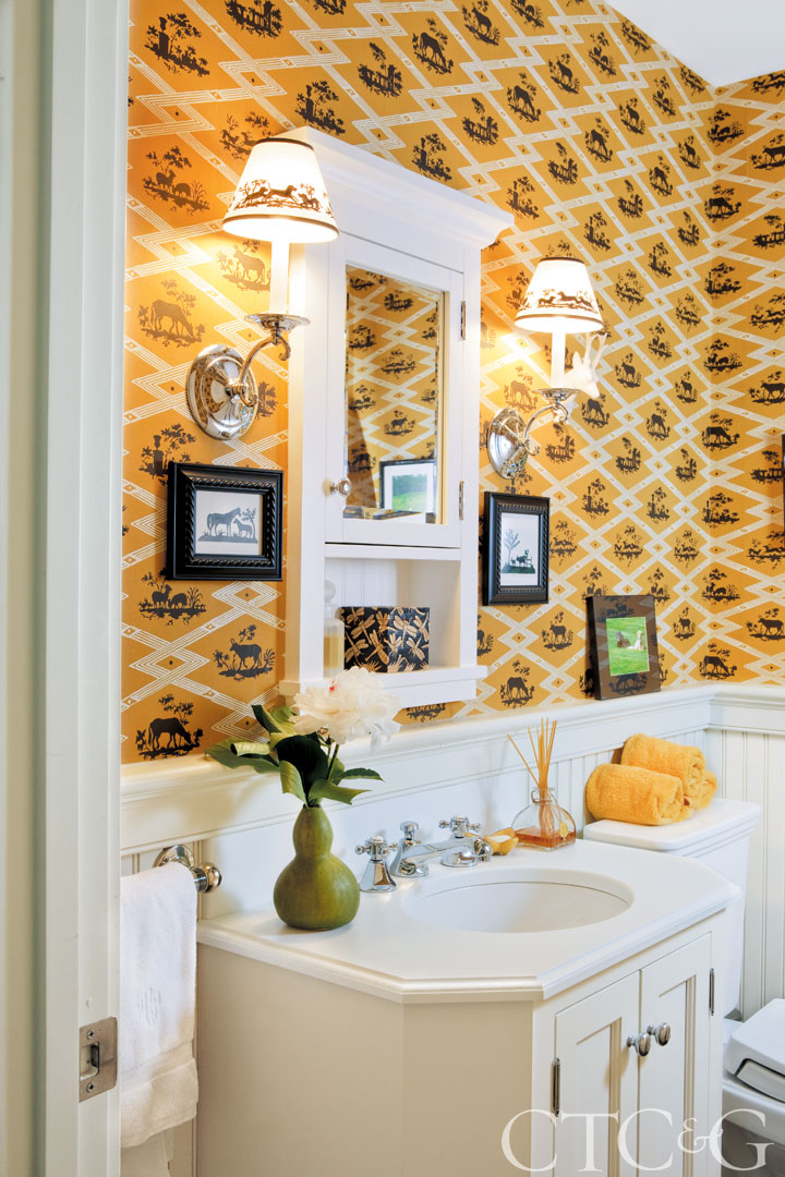 In the powder room, silhouettes of cows and stags fill the butterscotch-colored wallpaper with personality. The custom shades depict Labradors running. Medicine cabinet is from Restoration Hardware.