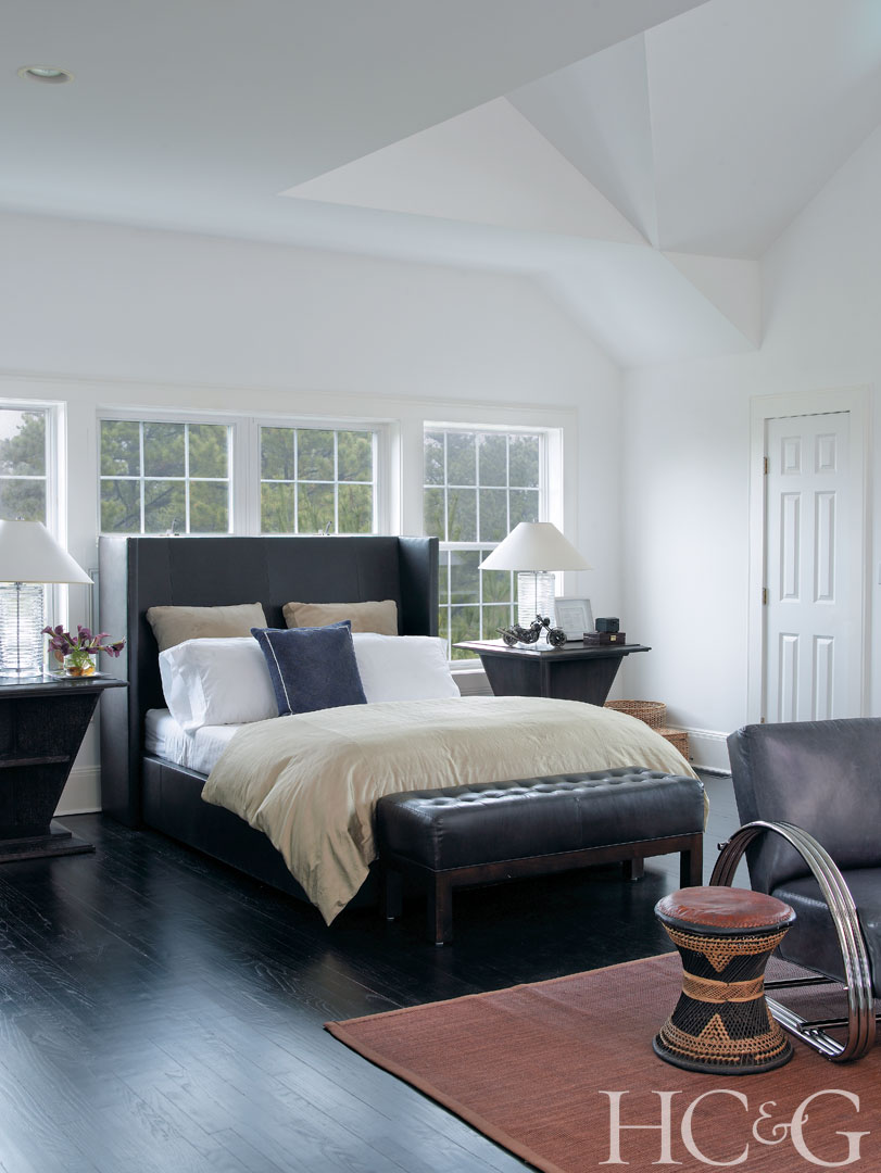 The focal point of Briley and Boler’s master bedroom is the black leather bed, flanked by night tables and lamps from Ralph Lauren Home.