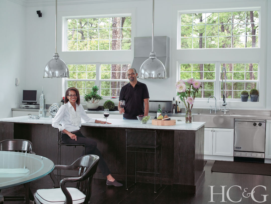 Black “spaghetti”-style bar stools complement the oak center island in the couple’s kitchen.