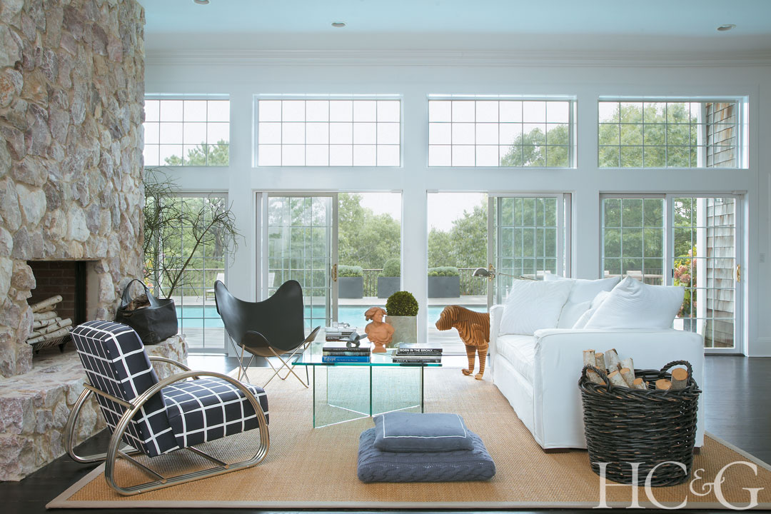 The light-filled living room includes a two-sided stone fireplace and doors that open to the deck and pool. The armchair, butterfly chair and glass coffee table are from Ralph Lauren Home; the cardboard dog sculpture, Rufus, was designed by Yuki Matsuoka.