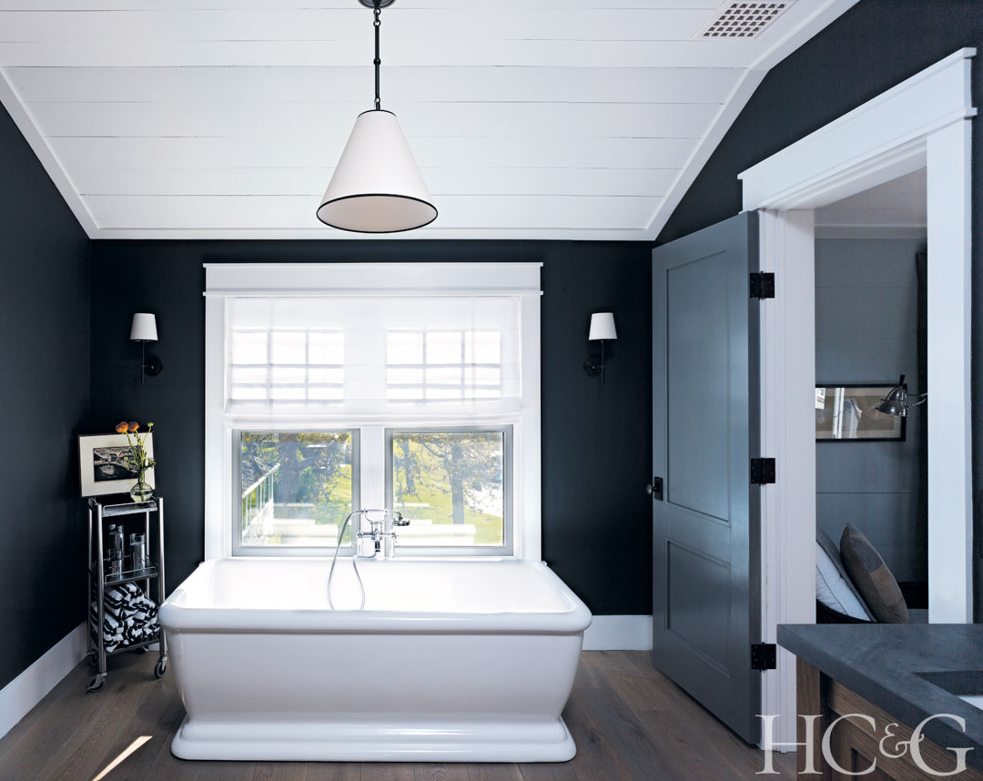 The master bedroom features views of Wooley Pond. The pendant is by Thomas O’Brien for Circa Lighting.