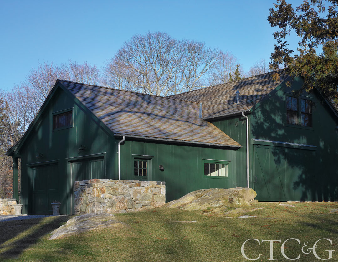 The homeowner hosts business meetings in the barn/home office for many Eastern European clients who consider a sauna followed by a cold plunge to be part of the process. Inside, the dressing area features tile walls, and the honey onyx stone floor is from ABC Stone.