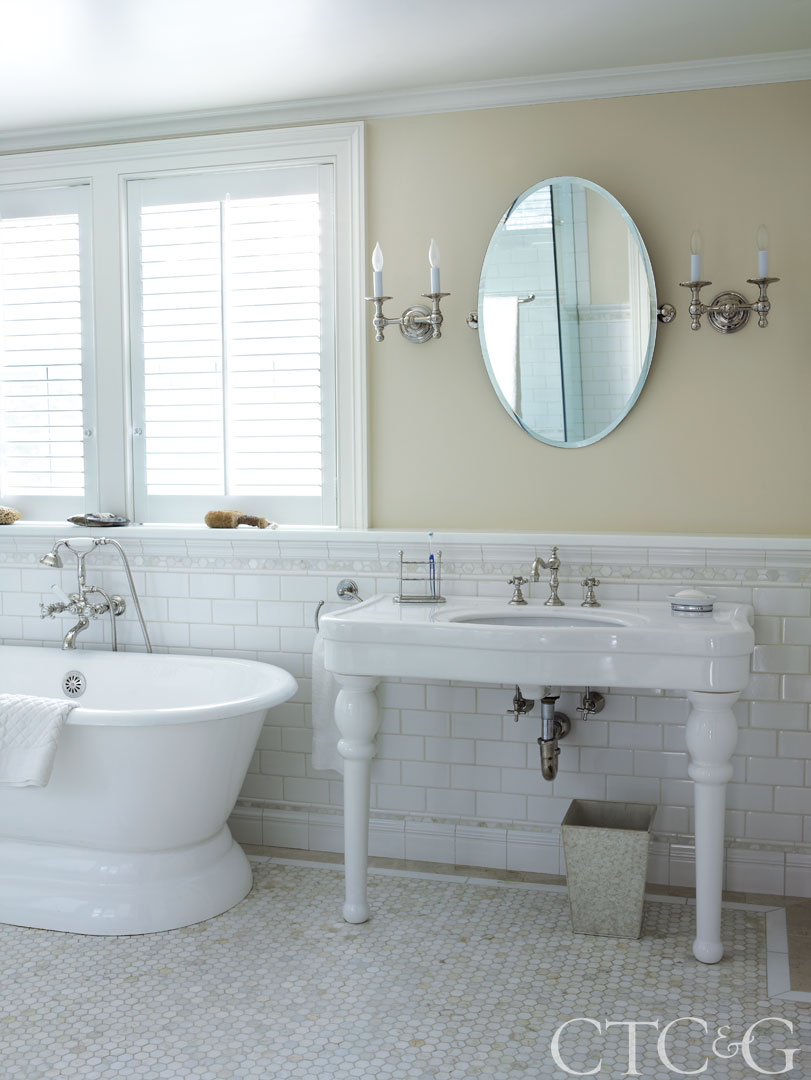 Ceramic Design’s Star White subway tiles form a wainscot in the master bathroom.