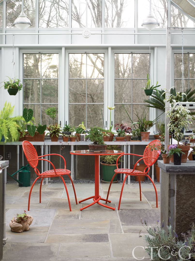 The floor in the Colebrook Conservatories greenhouse is a New York bluestone over a heated slab, with crushed stone around the perimeter for drainage.