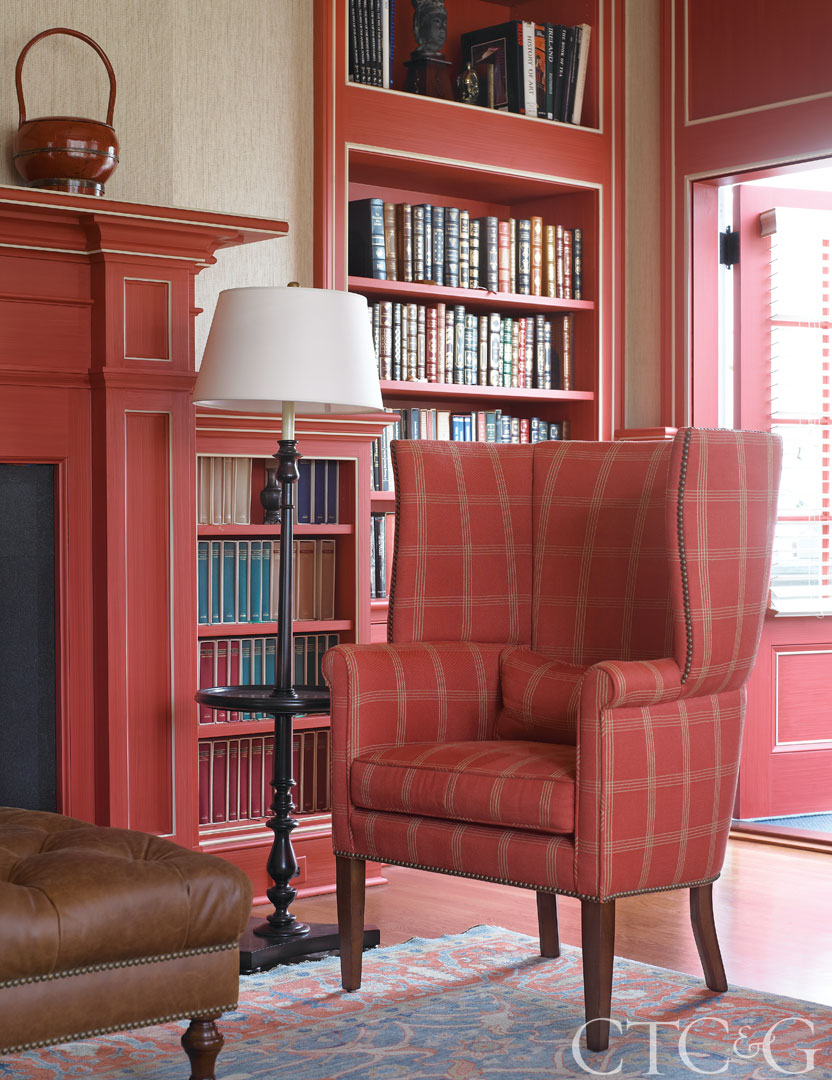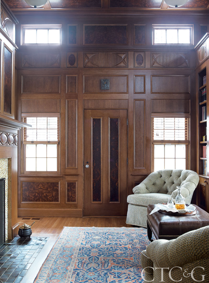 The wood variations add visual interest in the library, where a pair of tufted chairs flank a leather ottoman. The mosaic tile fireplace surround by Ceramic Design is new.