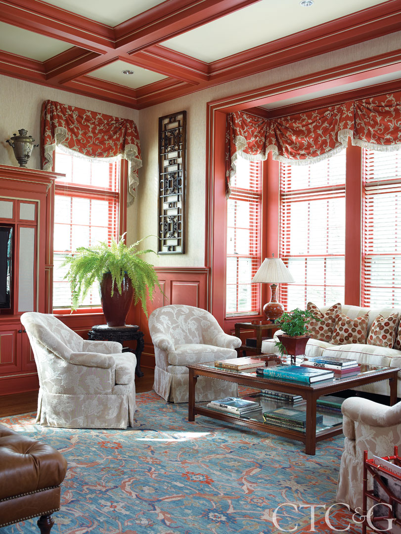 In the family room, Venetian plaster walls combine with bold painted woodwork. The window treatment fabric is Cowtan & Tout with trim from Samuel & Sons. Lee Jofa chairs topped with Cowtan & Tout fabrics, and a George Smith sofa are grouped around a custom Nininger & Co. coffee table.