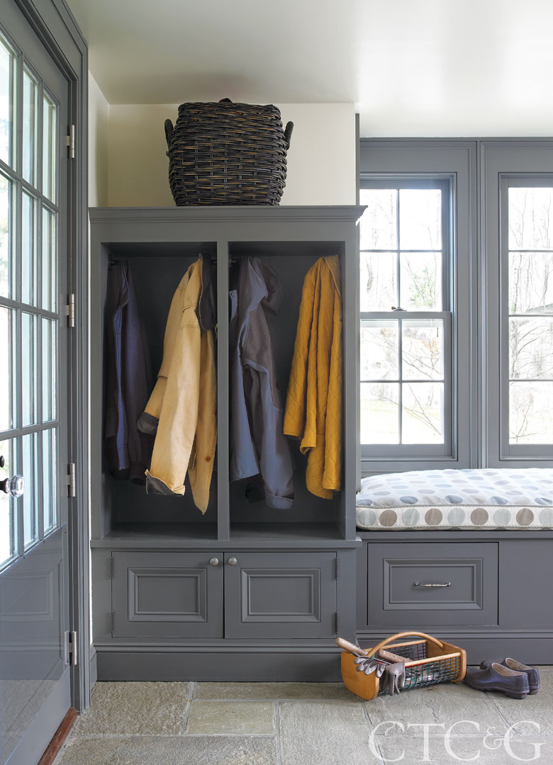 A window seat covered with Pindler & Pindler fabric provides a place for removing shoes and boots in the mudroom.