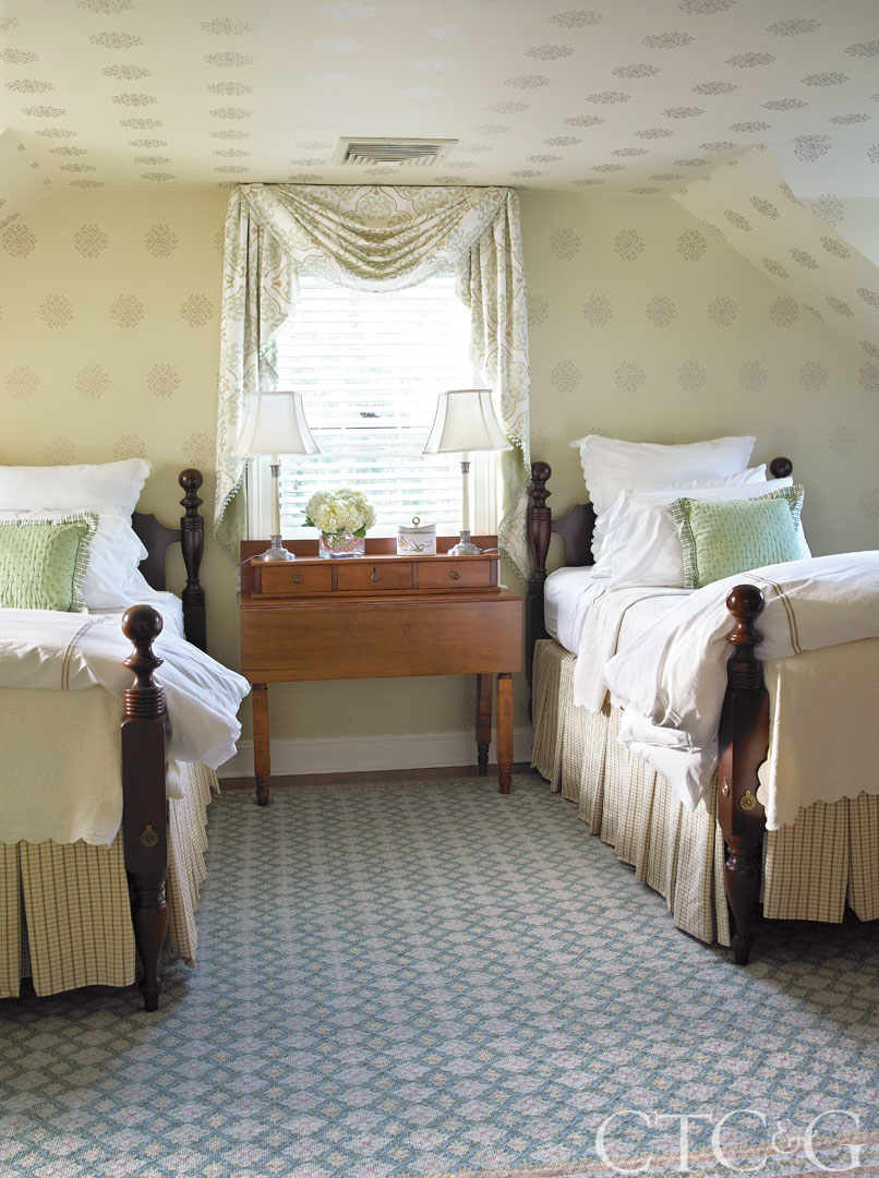Lee Jofa wallpaper covers the walls and ceiling in the guest bedroom.