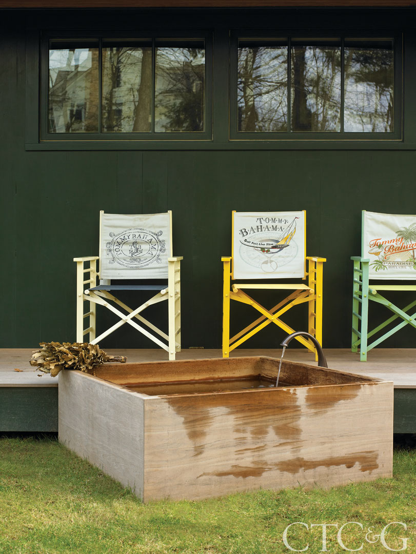 Outside, a trio of colorful director style chairs provides a place to enjoy some sunshine following a cold dip.