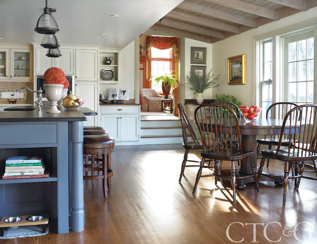In the kitchen, wood table is from Guy Chaddock; chairs are from Holland & Company. Lantern-shaped fixtures from Klaff’s light the island.