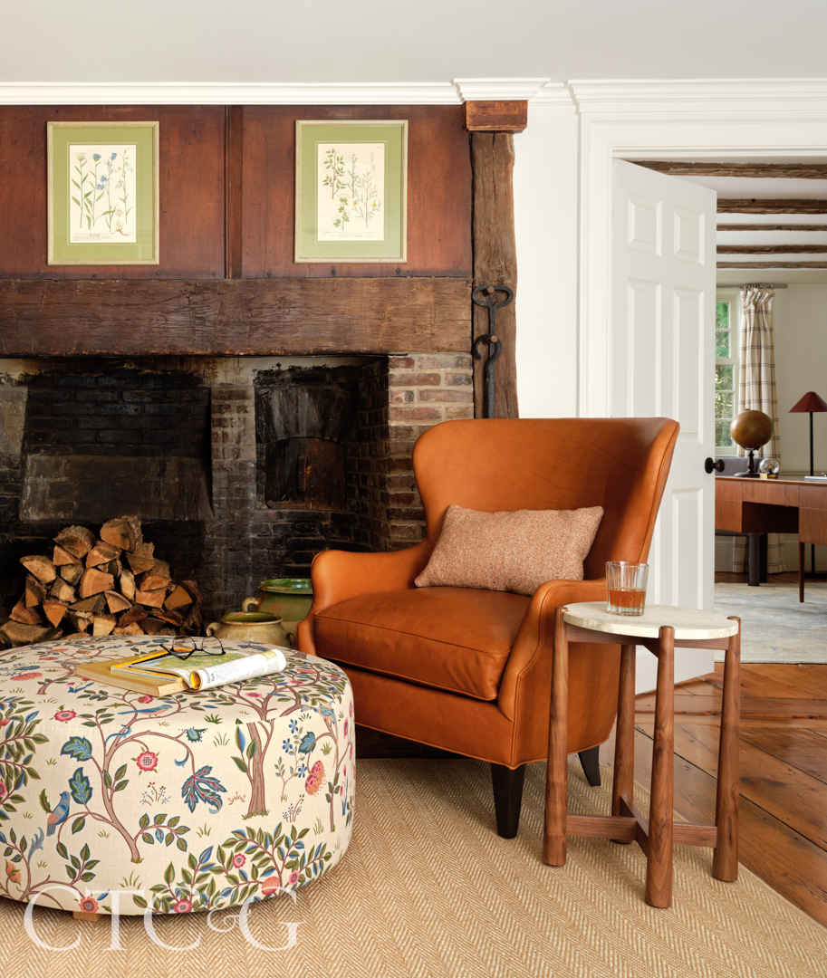 This is not the first time that this saltbox has appeared in print: The house made its editorial debut in Country Life in 1931. The article documented how Lurelle Van Arsdale Guild—an artist, noted industrial designer and antiquarian—moved the circa-1690 house from Stratford to its current location in Darien. By the time interior designer Lexi Brandfon, of Brooklyn-based Lex & Hudson, was hired to decorate the house, it had been significantly expanded in 2006, but the original portion remained remarkably intact with its timber framing, wide-plank pine floors, and even a secret staircase. “I was really interested in buying a historical house,” says the homeowner, who is trained as an architect. “I like when things are a bit wonky and imperfect.”