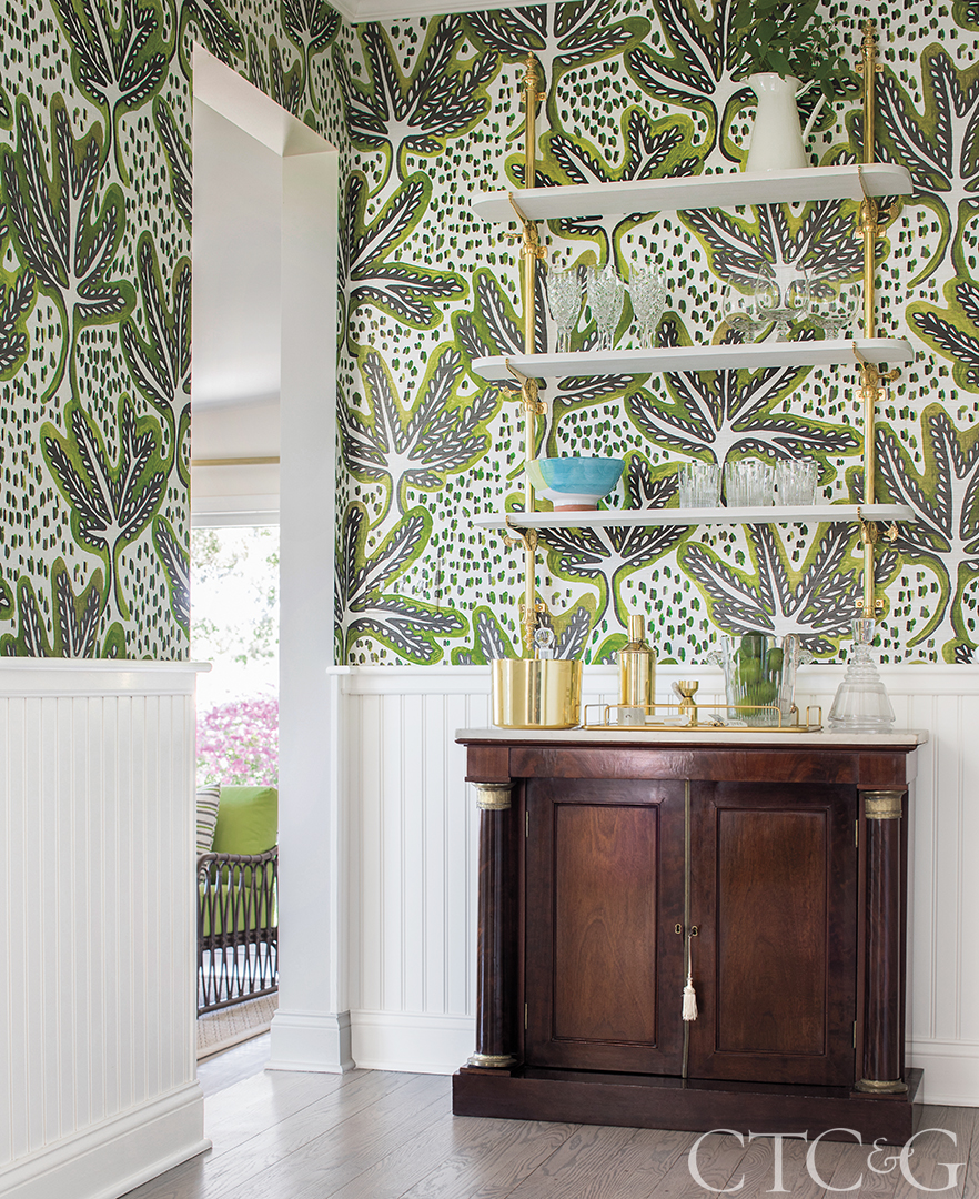 Tucked away in a niche next to the living room is a bar, a holdover from the homeowners’ Manhattan apartment. “We went a little wild with this space, used mostly during times of the day when the water view recedes,” explains Leonard. In the very first design meeting, the client loved the exuberant green and brown Pierre Frey grasscloth wallcovering.