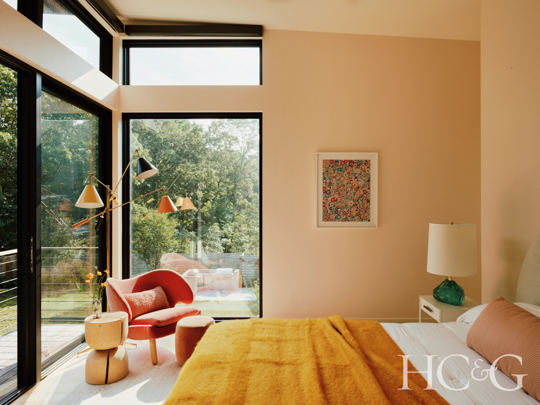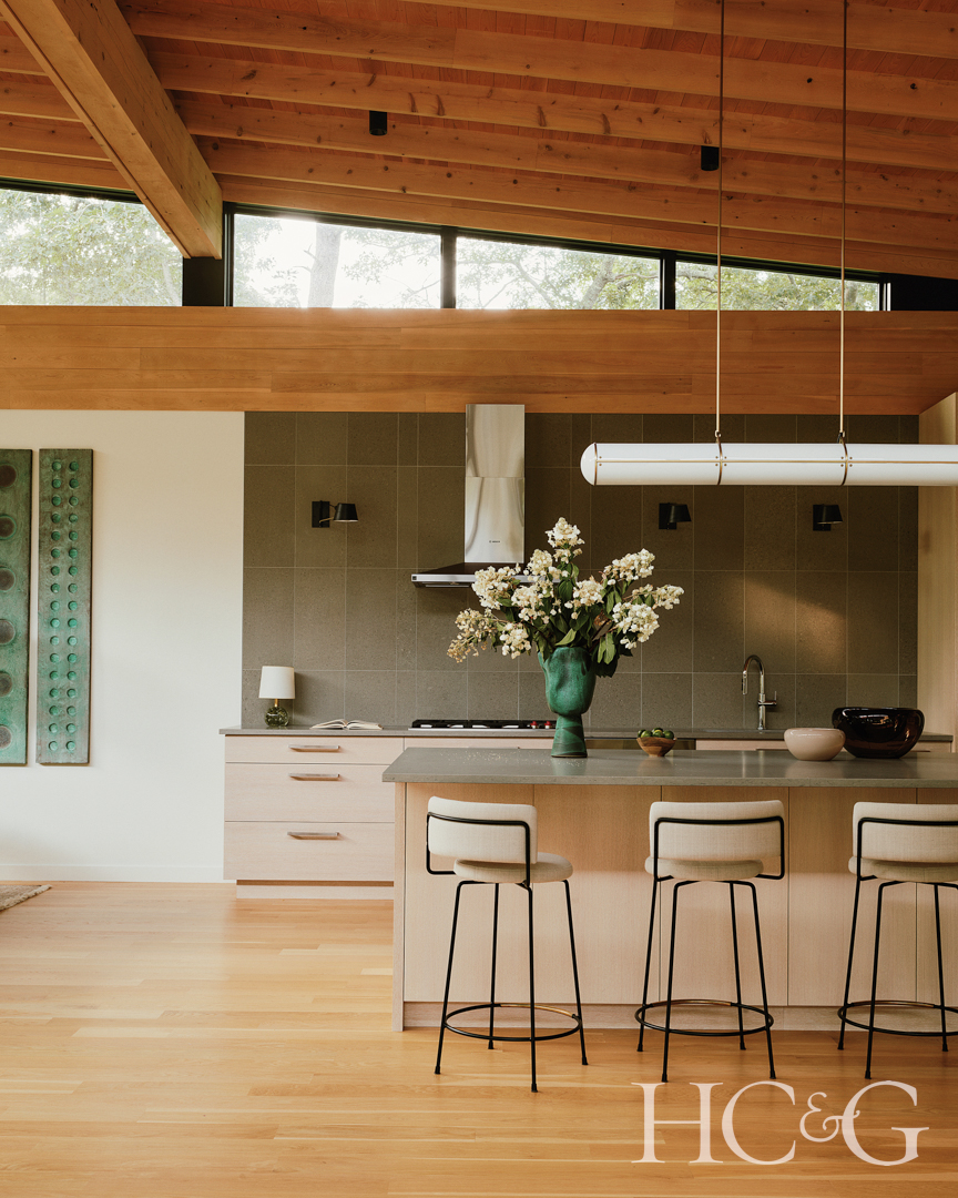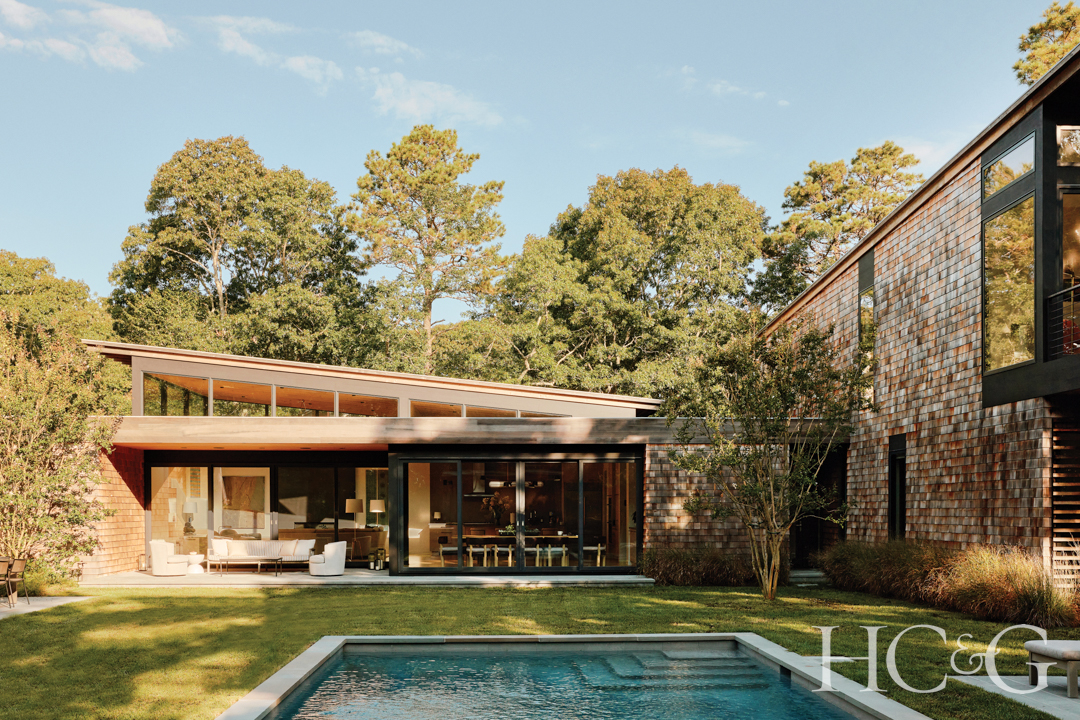 The house appears at first glance as two separate dwellings—but linked. The public living areas are contained within a structure that assumes an elegant mid-century profile on the wooded site, with its angled roof and generous expanses of clerestory windows. Meanwhile, the two-story bedroom wing appears as a shingled rectangular element off to the side, with an upward sweeping roof, appearing to take flight over the yard and pool. Despite the two somewhat differing architectural elements, everything within harmonizes. The homeowner’s stated desire for “soothing, calm rooms with subtle pops of color” was answered. “I didn’t want bland. We wanted to be able to walk in and feel relaxed, not jarred.”